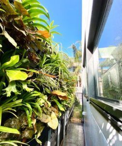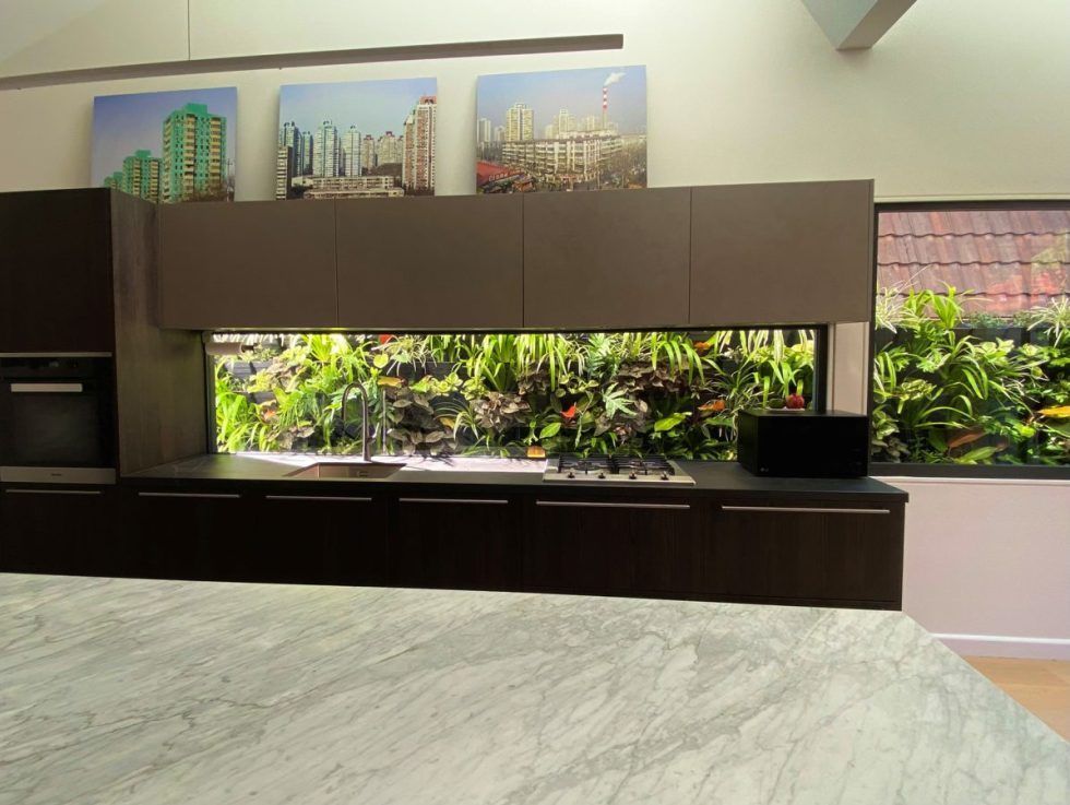 This is a beautiful example of incorporating nature into our modern lives. The sleek kitchen design pairs seamlessly with the deep tones of the shade loving plants outside.
