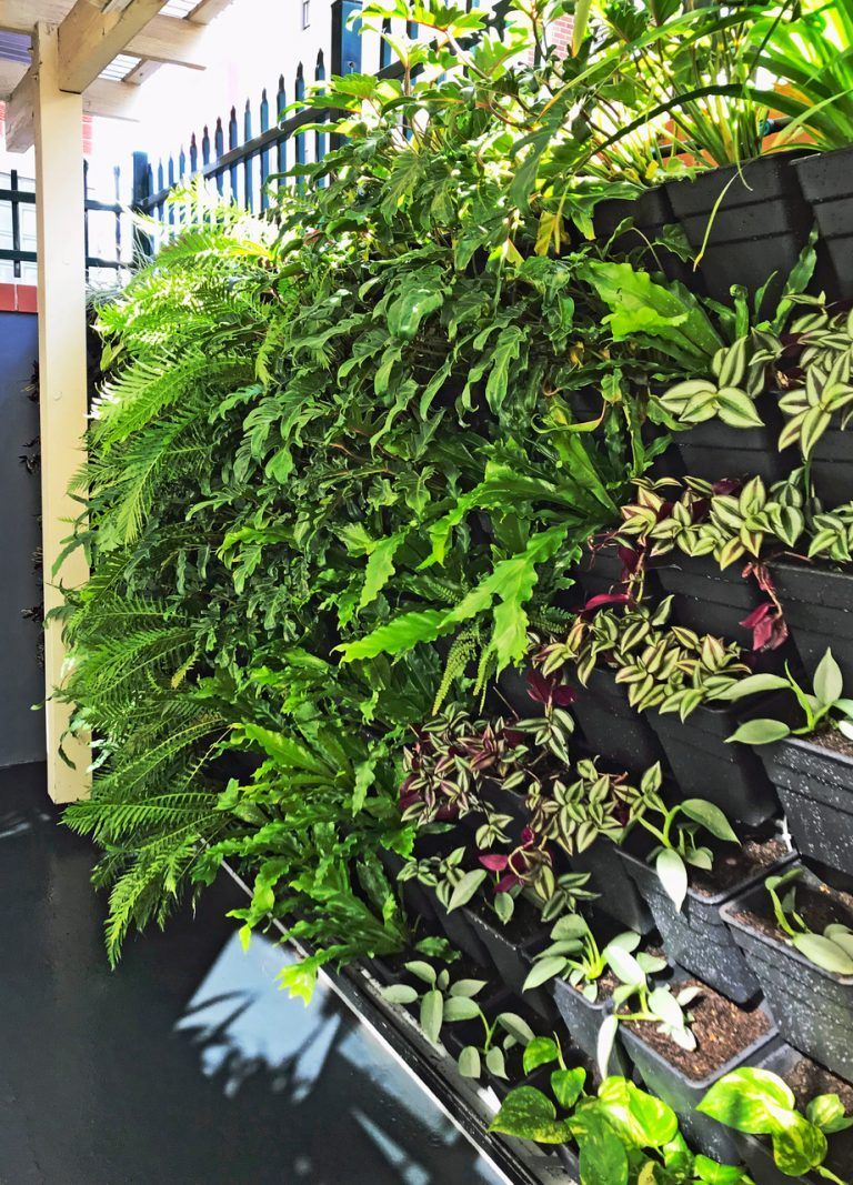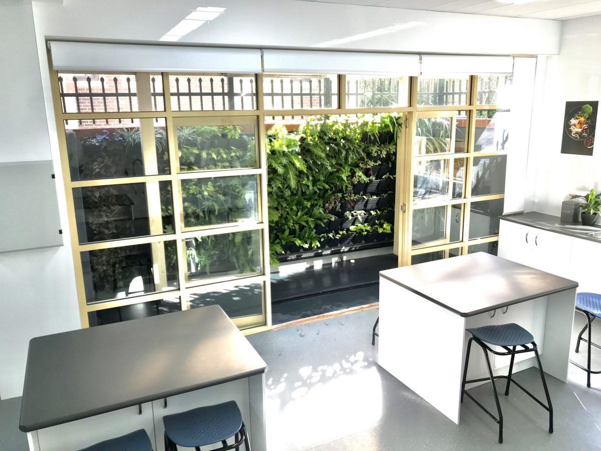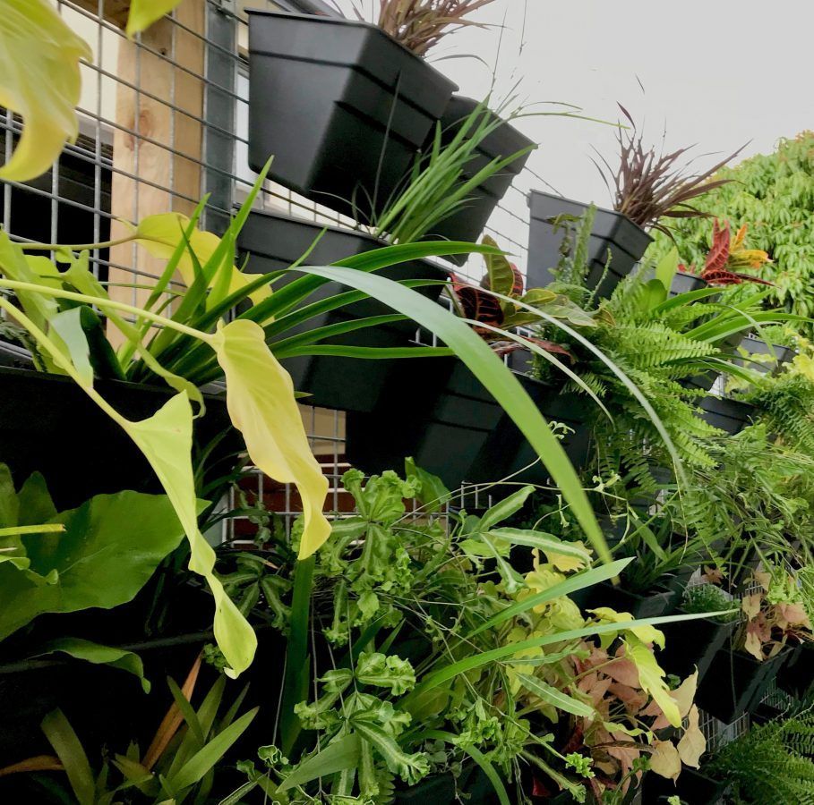 Vertical Garden for cookery classroom installed with shade tolerant plants. In an area where students are engaged in practical work, we've enhanced an otherwise plain stone wall. Growing Well is providing additional vertical garden spaces for classes to grow edible herbs.